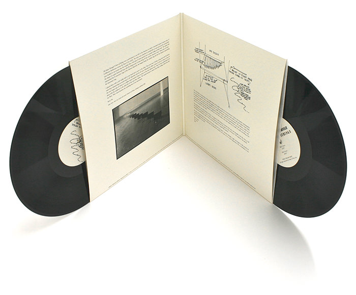 552 Steps Through 11 Pairs of Strings, which, as with most of Terry’s Fox’s works from the 1970’s, draws its ideas from the labyrinth at Chartres Cathedral in France, is the result of a 4½ hour performance where the artist stretched 11 pairs of piano wires of 11 different thicknesses across the floor - creating a giant horizontal harp. The audience was positioned in the dark loft on the floor below - within what became the instrument’s resonant chamber. Fox played the the strings with a soft mallet in one hand and a score - a 34-foot string tied with 552 knots, in the other. Each knot represented a step in the Chartres labyrinth, with the 34 turns indicated by either a piece of wire in a knot (a move to the next longer pair of wires) or a rubber band around a knot (a move to the next shorter pair). The outcome, as it appears on this remarkable double LP, are stunning - a revelation in idea, practice, and sound - an unrecognized precursor to the work of Ellen Fullman and Arnold Dreyblatt. Comprised of four selections from the performance, its presents an resonant world of rhythm and bass - a deep rumbling, which often uncannily recalls the artists most famous work - The Labyrinth Scored For 11 Different Cats.