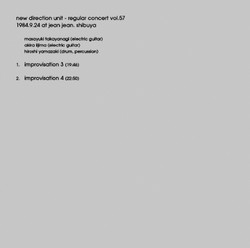 Masayukia Takayanagi, electric jazz guitar. Nobuyoshi Ino, contra bass. Hiroshi Yamazaki, drums. Recorded live at Yokohama Airegin on August 26, 1984. Remastering and remix by Yukio Kojima from Takayanagi's private tapes. Linernote (in Japanese) by Kazuo Imai.
