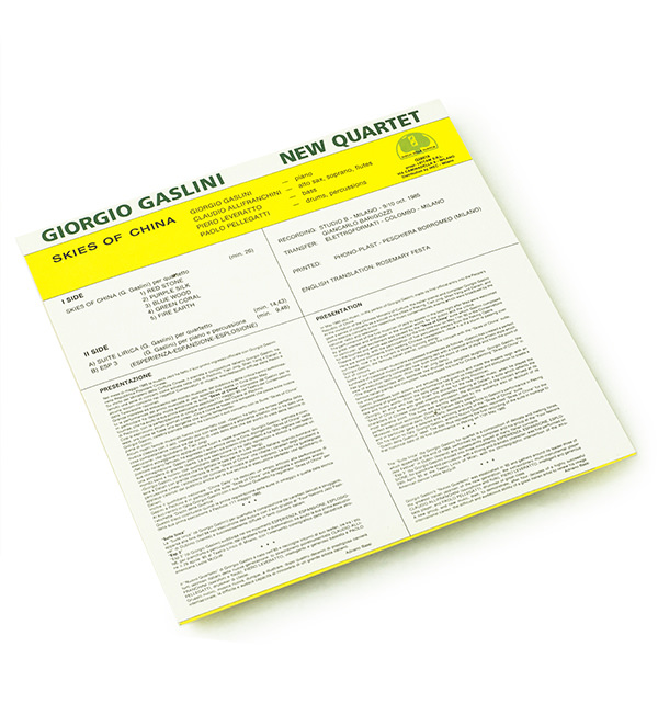 **Original 1985 vinyl edition of the album. Few copies available** What emerges from Giorgio Gaslini’s various suites is a happy explorer, recalling worldly journeys and launching musical adventures. He was the first Italian jazz musician to play in India and China and the result of each journey was an extended suite. Gaslini’s own language that emerges triumphant, a fondness for floating clusters and fractured boppish themes (his writing can hint at influences from Monk to Schoenberg, George Russell to Shorty Rogers) among which the Indian elements are merely incidental. The title suite of Skies of China is filled with a delicate light, a springboard for flutist Claudio Allifranchini and bassist Piero Leveratto