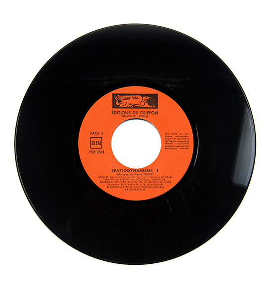 Original 1963 copies of this legendary reference monograph, with the musical piece Spatiodynamisme by Pierre Henry on a 45RPM vinyl record. English edition. Based on 1954 recordings of a Nicolas Schöffer‘s sculpture, this music was elaborated in Pierre Henry‘s first private studio APSOM, active around 1954-58, while Henry was still a member of Pierre Schaeffer’s Groupe de Recherche de Musique Concrète. The music was intended as the soundtrack to the first Tour Spatiodynamique Cybernétique et Sonore, a cybernetic sculpture erected by Nicolas Schöffer in Saint Cloud, France during the 1955 ‘Salon du Bâtiment et des Travaux Publics’ fair, with technical help from a Philips Company engineer, Pierre Bureau. Metallic parts, mirrors, lighting and sounds emanating from the 50 meters high building interacted with the environment and visitors.